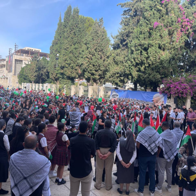 "Cet événement a inclus des discours de Mohammed Taha Abu Alya, gouverneur par intérim de Bethléem, du maire de Bethléem et de plusieurs personnalités religieuses islamiques et chrétiennes. Les étudiants ont prononcé des discours en arabe, anglais et français pour transmettre le message de notre peuple au monde. Des déclarations émotionnelles ont souligné la situation désastreuse à Gaza sous les bombardements et l'agression, accompagnées de chansons nationales et humanitaires dans plusieurs langues, reflétant un message humain des enfants de Bethléem et de Palestine au monde.